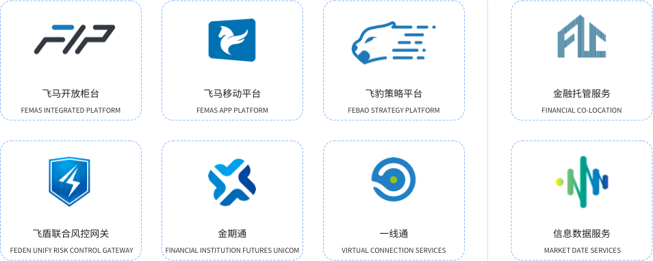 以便利機構(gòu)客戶參與金融期貨市場、助力金融期貨市場發(fā)揮風(fēng)險管理功能為目標,具體包括:飛豹做市商平臺、飛馬證券版、飛盾風(fēng)控網(wǎng)關(guān)等。